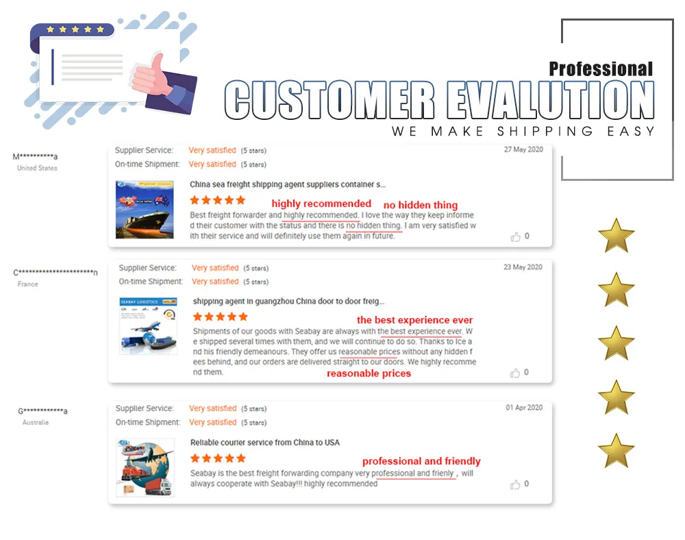Seabay, Your Reliable China Shipping Agent.Seabay international freight forwarding ltd.1, China top 10 logistics company.2, Shipping service to the worldwide.3, Reasonable price with best service.Company Information:1, Authorized Class A freight forwarder, and members of CGLN, WCA & CIFA. 2, Ma......